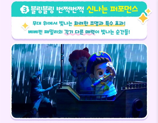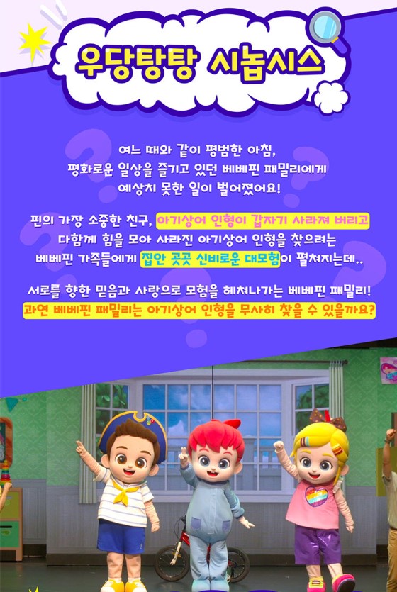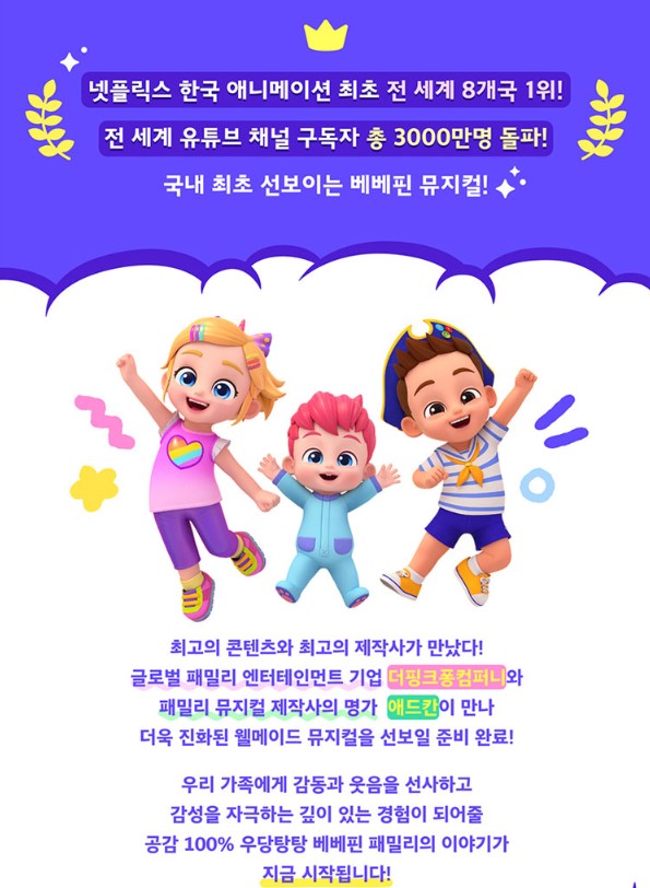 넷플릭스 한국 애니메이션 최초로 전 세계 8개국에서 1위를 차지한 <베베핀>이 국내 최초로 뮤지컬을 선보이고 있습니다. 글로벌 패밀리 엔터테인먼트 기업인 '더핑크퐁컴퍼니'와 패밀리 뮤니컬 제작사의 명가인 '애드칸'의 협업으로 웰메이드 뮤지컬이 탄생했다고 하는데요.