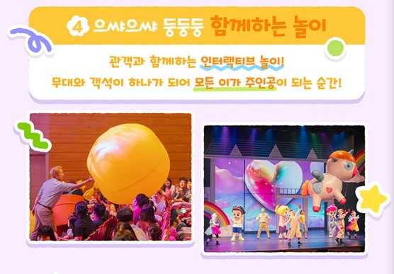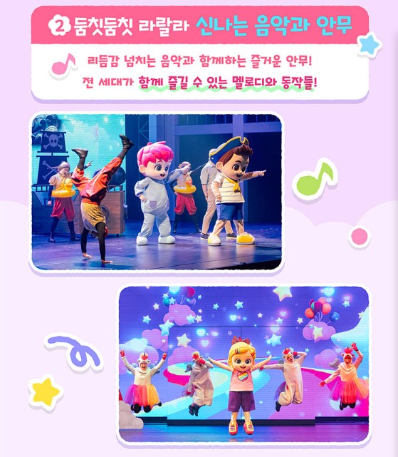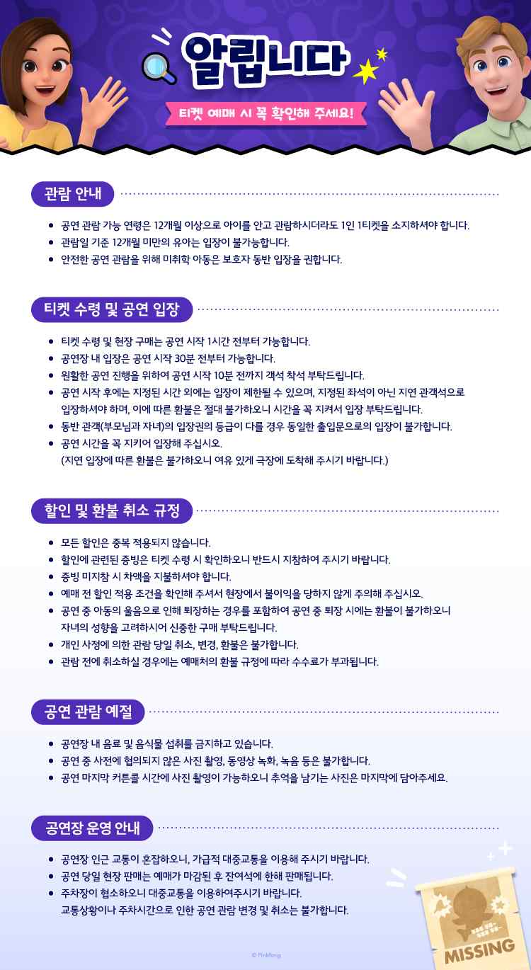 | 관람연령 | 12개월 이상 관람 가능 ※ 12개월 이상 1인 1티켓을 반드시 소지하셔야 하며 부모님이 자녀를 안고 보시더라도 부모님과 자녀 모두 같은 등급의 티켓을 소지하셔야 합니다. ※ 공연 관람일 기준 12개월 미만 유아는 유료티켓이 있어도 입장 불가능합니다. |